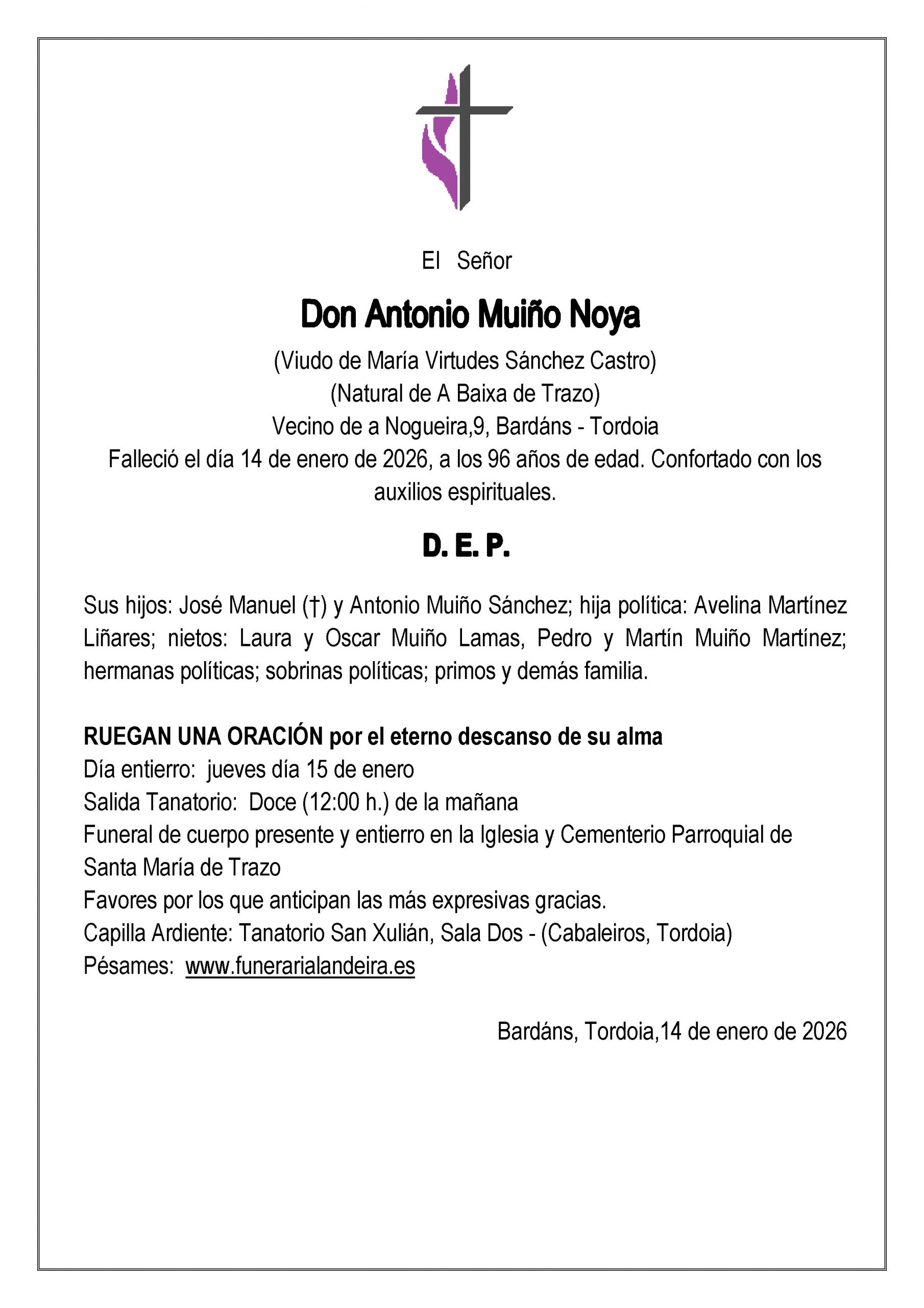 Falleció el día 14 de enero de 2026, Natural de A Baixa de Trazo, Vecino de Bardáns – Tordoia