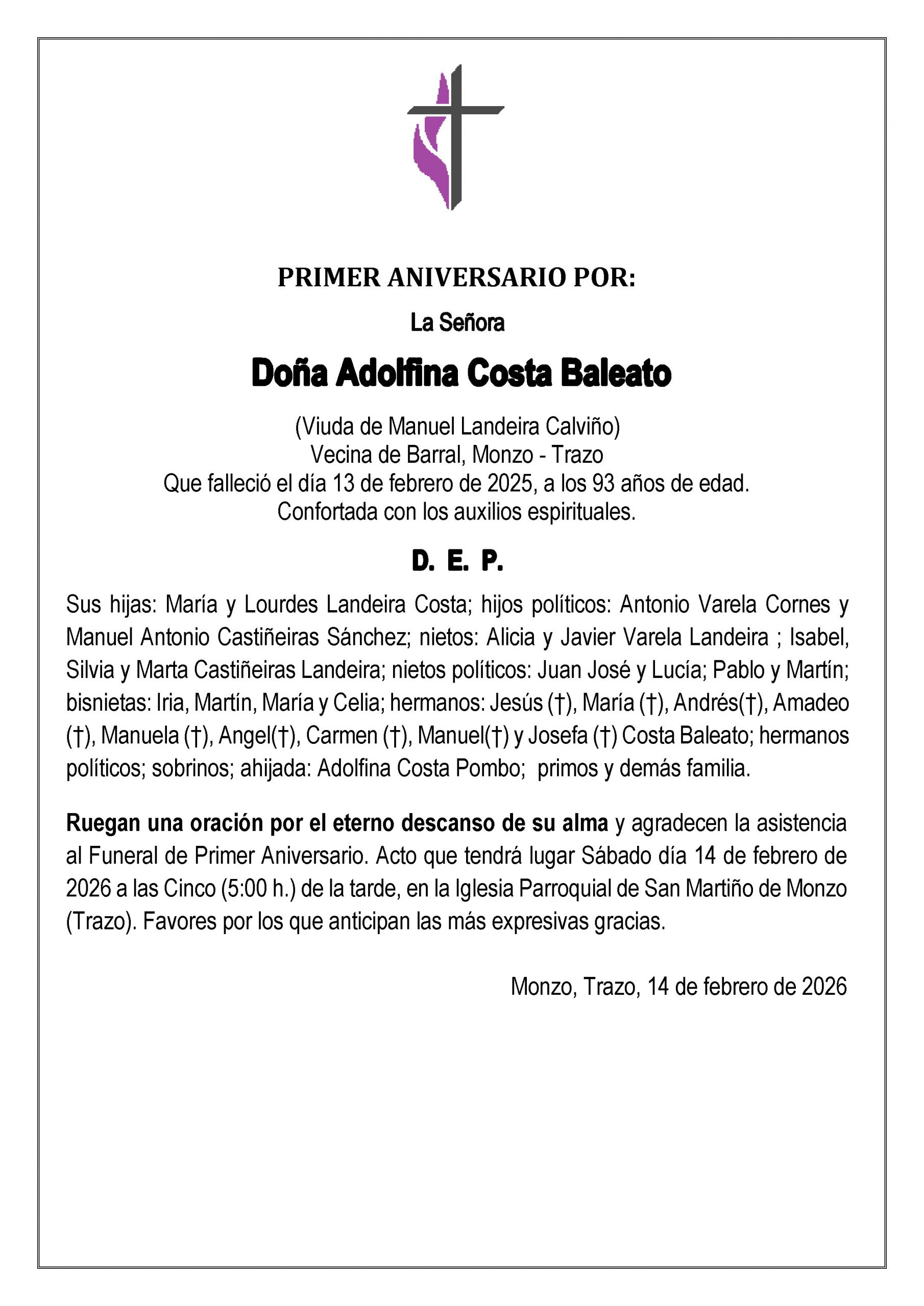Primer Aniversario. Tendrá lugar sábado día 14 de febrero de 2026 a las 17:00 h. en la Iglesia Parroquial de San Martiño de Monzo – Trazo